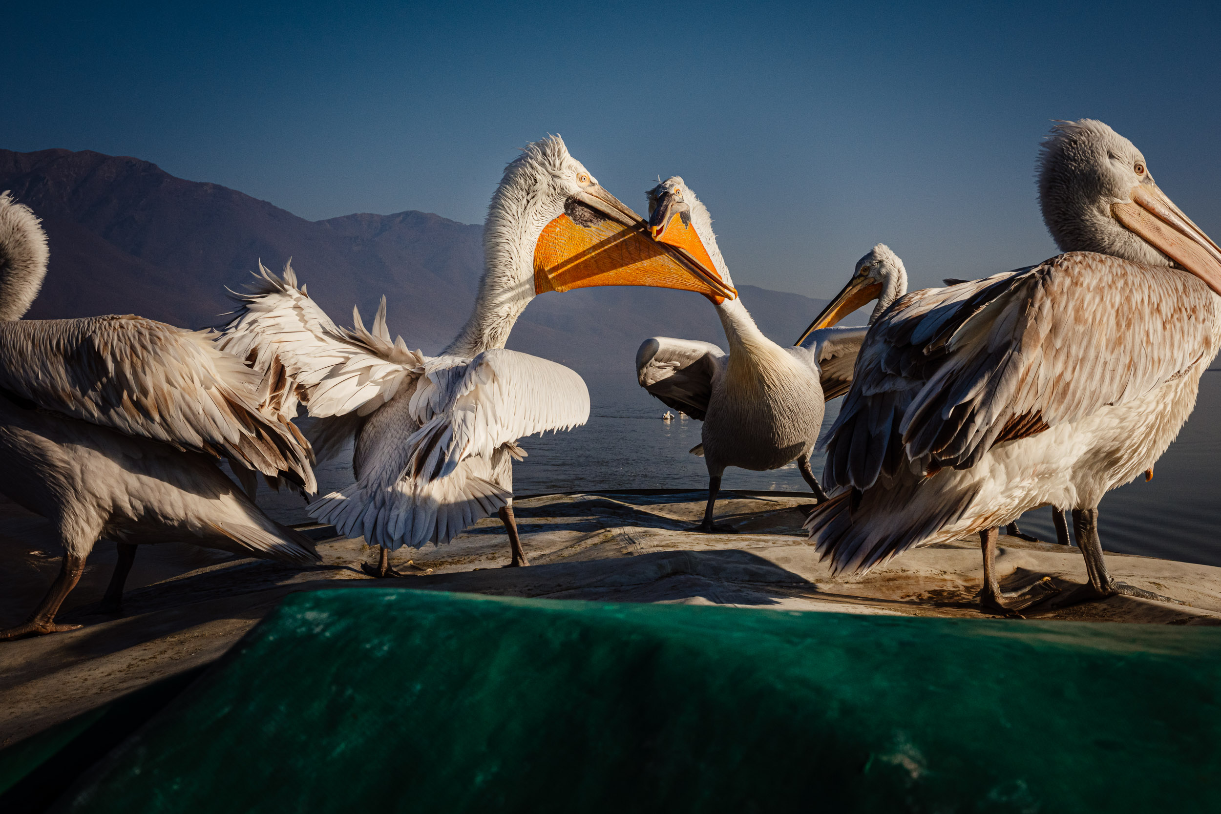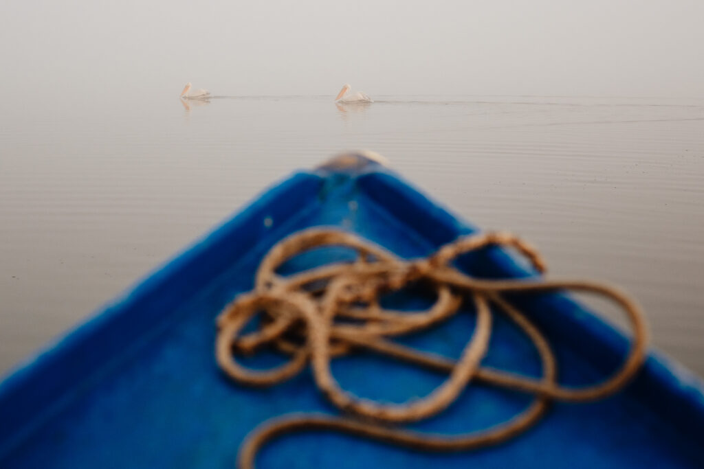 A few minutes later the boat stopped in the middle of nowhere, with the visibility being no more than 30 feet in any particular direction. Anestis then proceeded to call the birds, shoting “Ela, ela”, meaning come, come, in Greek. I wasn’t sure if he was trying to get them to come to us or trying to chase them away from us. Me and dad started laughing. To our disbelief two pelicans showed up in a matter of minutes and what followed was nearly 2 hours of us and the two birds in the middle of the foggy lake.